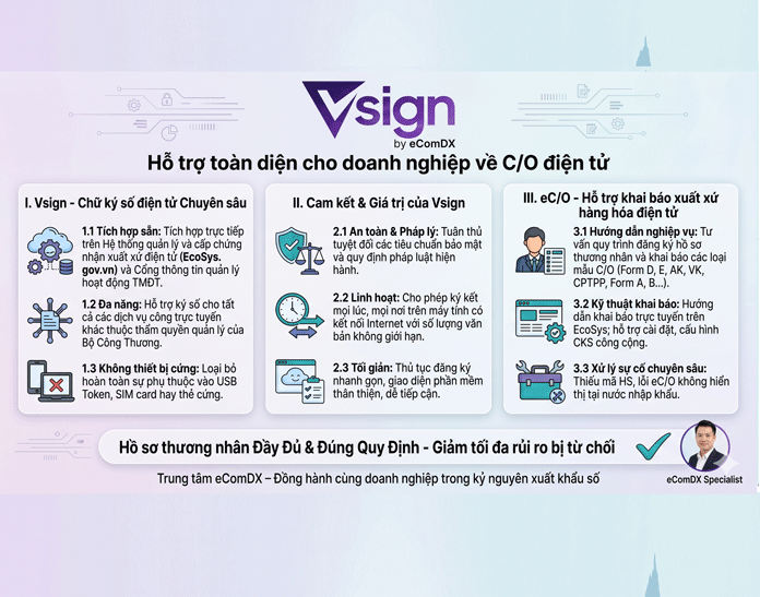 Nhằm tối ưu hóa quy trình xuất nhập khẩu và thực hiện thủ tục hành chính công cho doanh nghiệp, Trung tâm Phát triển thương mại điện tử và Công nghệ số (eComDX)  đồng hành cùng doanh nghiệp trong kỷ nguyên xuất khẩu số thông qua việc cung cấp bộ giải pháp chuyên biệt, kết hợp giữa công nghệ ký số hiện đại và nghiệp vụ hỗ trợ chuyên sâu về khai báo xuất xứ hàng hóa (eC/O).